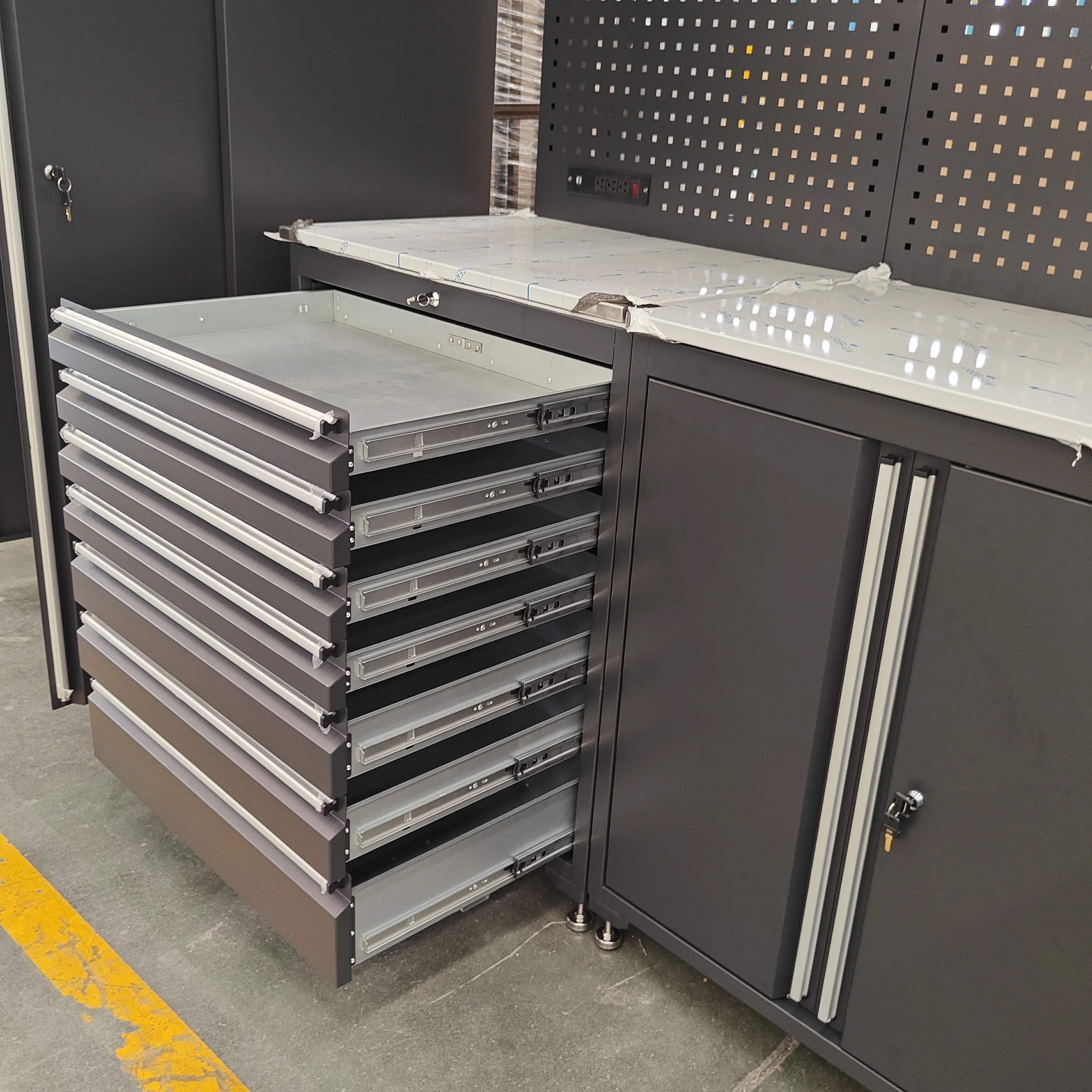 ভারী শুল্ক সরঞ্জামের ক্যাবিনেটের ড্রয়ারগুলি নীরব স্লাইডিং রেলগুলিতে সজ্জিত, ড্রয়ারগুলি খোলার বা বন্ধ করার সময় কোনও শব্দ নিশ্চিত করে না।